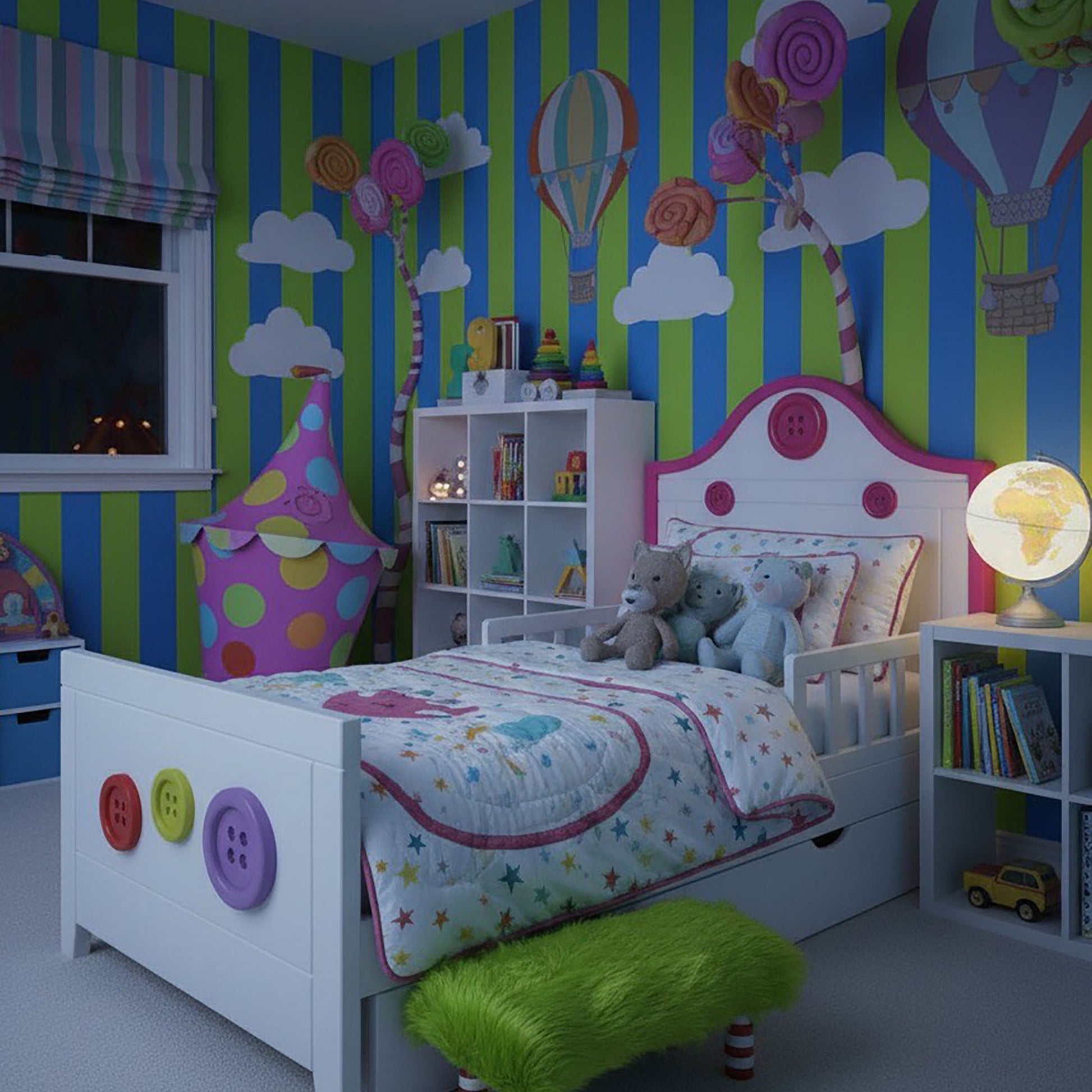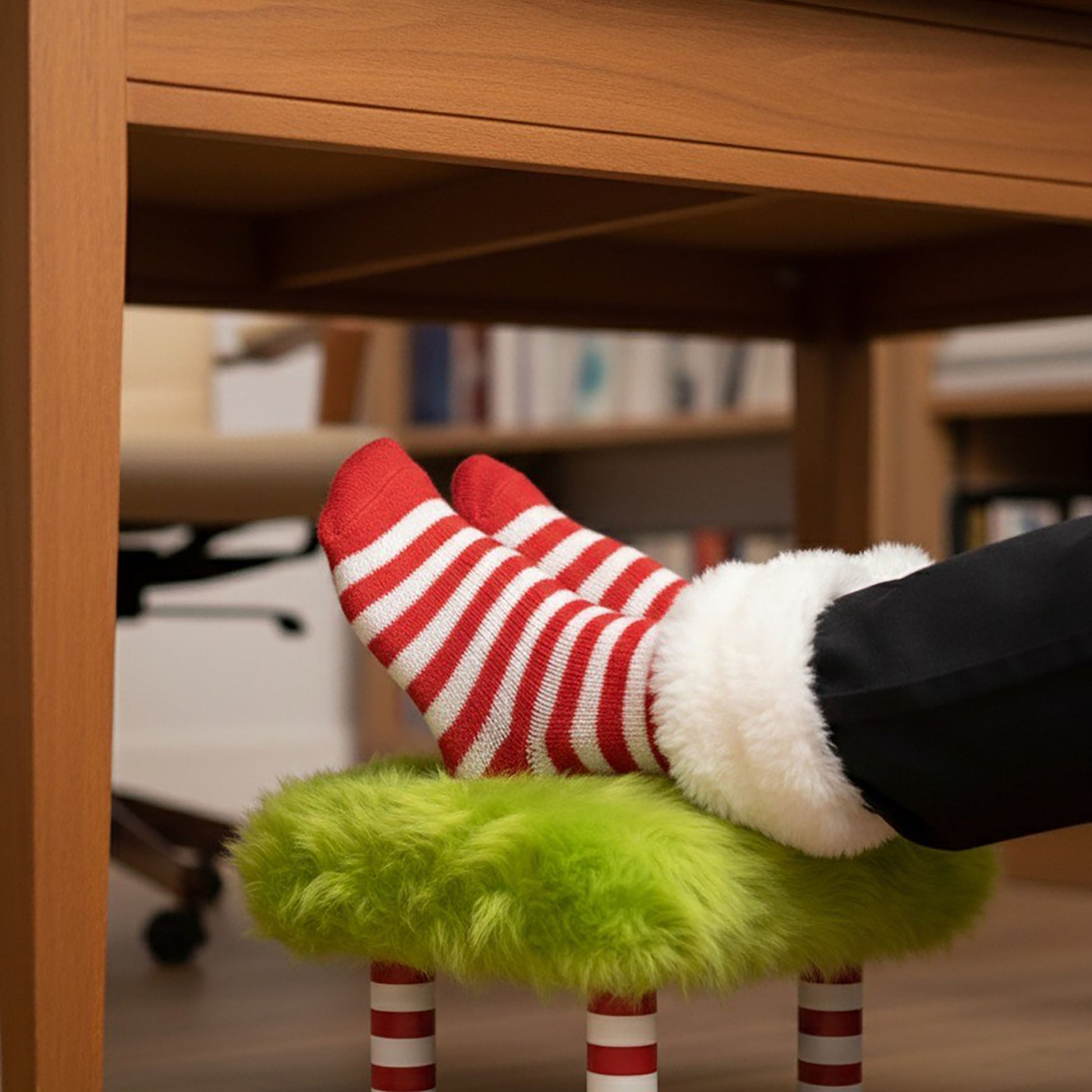 The base is hand painted with red-and-white striped legs reminiscent of candy canes, while the top is padded with thick, high-density foam and wrapped in bright lime green shaggy faux fur that practically begs you to kick back and relax.